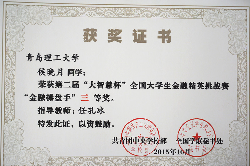 近日,第二届“大智慧杯”全国大学生金融精英挑战赛圆满落幕,我院侯晓月等四名同学获得“金融操盘手”三等奖。