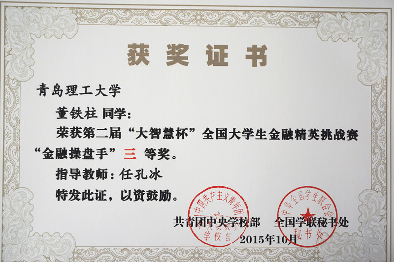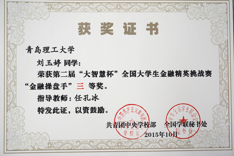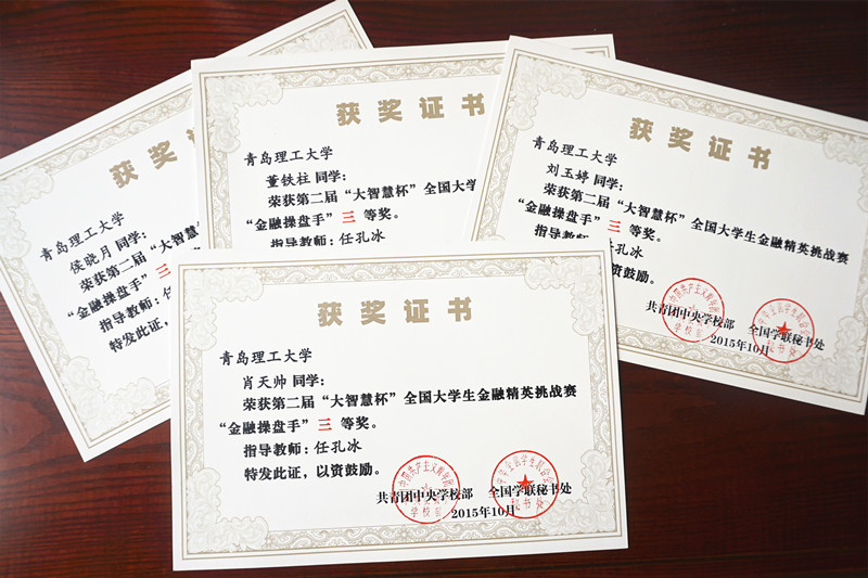 第二届“大智慧杯”全国大学生金融精英挑战赛是由共青团中央学校部和全国学联秘书处主办、上海大智慧股份有限公司承办的大学生金融模拟赛事,旨在推动青年学生“金融创业梦”计划,搭建金融届产学研交流合作平台。比赛从2015年3月开始至2015年10月结束,使用大赛专用平台,以A股、港股、股指期货三个投资品类进行投资策略比拼。我院团总支在比赛前积极宣传,组织学生积极报名参赛,并予以认真指导,学生参赛踊跃,精心准备,根据客观条件不知修改投资策略。最终,财务管理131班侯晓月、财管142班董铁柱、国商142班肖天帅和刘玉婷四名同学荣获本届大赛“金融操盘手”三等奖。